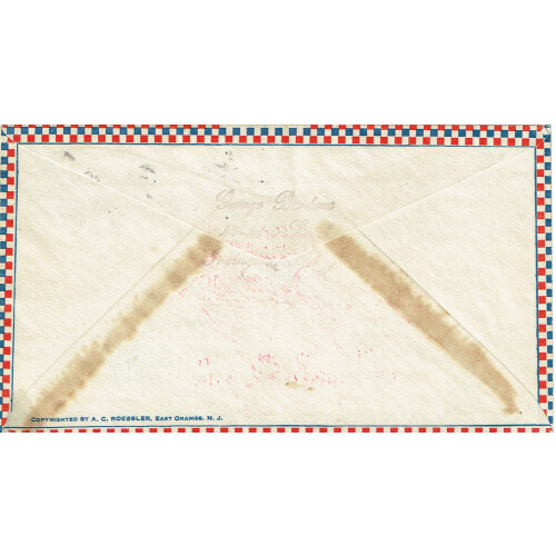 1932 Catapult Flight: Airmail printed cover bearing USA 9c & 11c defins tied NEWARK NJ July 27th cancels addr to Germany carried on SS Bremen and final flight to Southampton, then on Germany with red cachet and two line Frankfurt Flughafen h/s alongside, few minor tones.