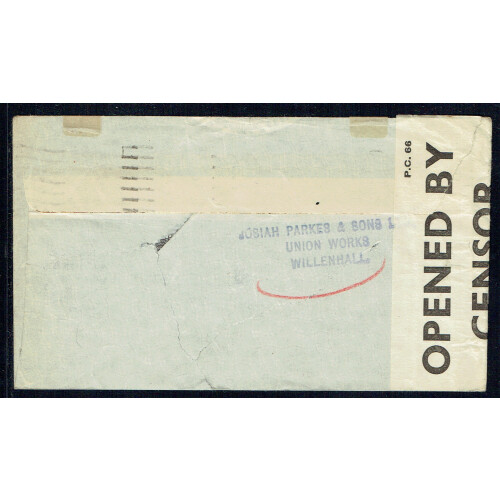1940 (3 Apr) POSTAL SERVICE SUSPENDED / RETURN TO SENDER h/s in violet on Censored cover Willenhall (UK) to Denmark, heavily torn on reverse, good strike.