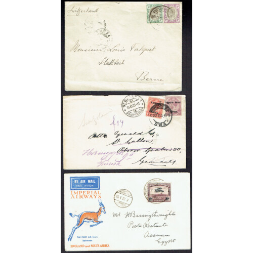 British Africa: Group of interesting covers addr to Switzerland including SWA 1951 combn airmail, 1937 SWA Coronation set in pairs, 1932 Imperial airways printed env to Egypt bearing 10d airmail, 1925 GV SWA singles 1d & 2d from Windhoek, Transvaal 1905 ½d & 2d EDVII from Pietermaritzbueg, 1944 plain postcard bearing war midgets 3d & 6d PASSED BY CENSOR bilingual h/s in violet with German eagle h/s, 1925 S. Africa 1d P/S card uprated with 3d air, ½d green and S A LUGPOS h/s and airmail etiq. Intr lot (5).