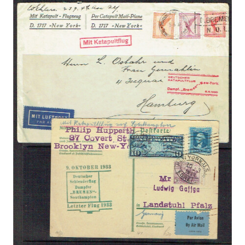 Catapult Flight Mail: Nice group of eight covers 1929-1935 including flights carried on SS Bremen, (6), Europa (2), with either German or USA stamps tied regular or special flight cancels, each cacheted and handstamped in various ways for each sailing & catapult flight. Some mixed but mainly fine. Attractive collection. (8).