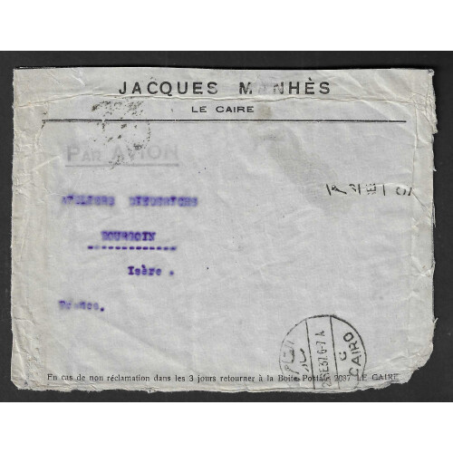 COURTIER 1937 Imperial airways crash cover stampless envelope from Cairo to Isere France (opened up for display) with reverse bearing large transparent printed label POSTES ET TELEGRAPHES with violet five line delay handstamp applied at the French post office and tied BORGOIN / ISERE cds. On 1st October 1937 the Imperial airways short empire G-ADVC Courtier crashed on landing in Phaleron Bay, Greece, due to poor visibility killing 2 of 15 on board. Most mails were salvaged and turned over to the Greek Post Office for onward transport.