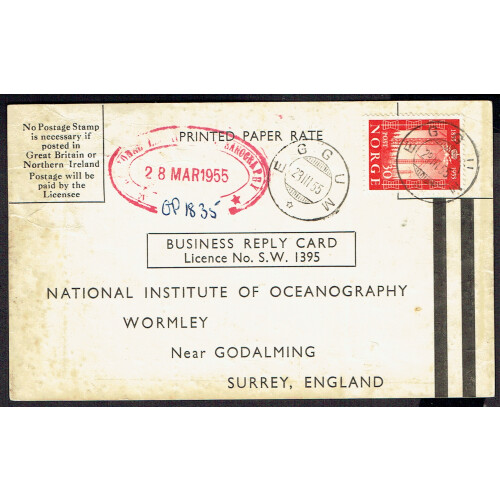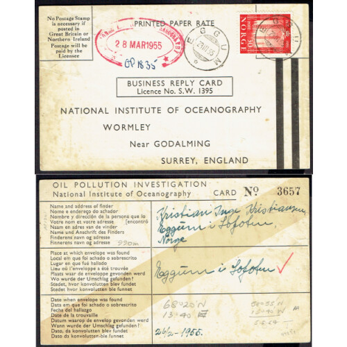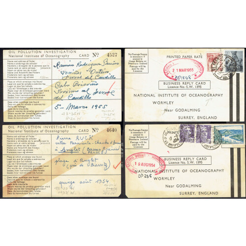 Drift Mail Card: 1954-58 Printed reply cards titled Oil Pollution Investigation dropped in the sea in plastic envelopes by the Nat. Institute of Oceanography, The drift envelope experiment in the North East Atlantic Ocean 1954. Five numbered cards completed and returned from Norway, Ireland, France, Spain, or UK. Interesting group. (5).
