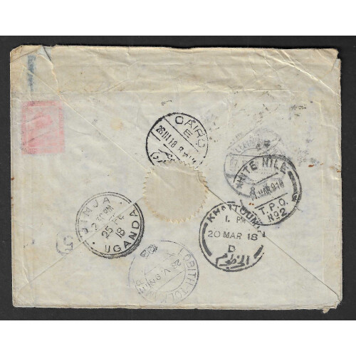 KINGSTONIAN - 1918 (11 April) DAMAGED BY IMMERSION IN SEA WATER boxed h/s in violet on obverse of cover with stamp washed off from Alexandria to Marseille, the cover is addressed to Holland and redirected. Sudan censor h/s on obverse and variety of transits on reverse incl Cairo, Jinja Uganda, Khartoum, White Nile and then the Steamer Kingstonian was badly damaged by German submarine U68, she was towed into Sardinia where the mail, about a fortnights correspondence from Egypt and Palestinian Front were offloaded. On leaving Sardinia the ship was again hit by a German U48 and sunk. Nineteen different types of handstamp have been recorded.