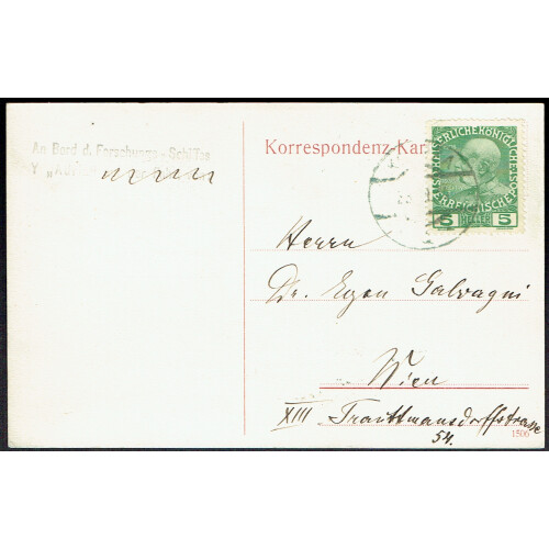Maritime: Austria 1914 (22 July) Postcard of the Research ship Y, Adria bearing 5h green adhs tied KOMIZA CDS to Vienna with two line An Bord d. Forschungs - Sc / Y,, Adriahiffes handstamp in black violet alongside (partially crossed out at the ending of the h/s), sent by Prof. Carl Cori board member of the Adria Association, very fine.