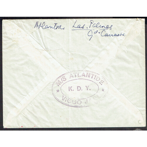 Maritime: Oceanographic Expedition off West Africa; 1949 airmail letter Las Palmas to Copenhagen from the Ship M/S Atlantide violet cachet on reverse made available to the University of Copenhagen off Gambia and finished in Angola. Torn on reverse.