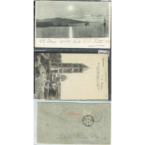 Maritime: S.S. Argonaut; three covers / cards transported on the vessel incl 1902 Horta via Gibraltar to UK (tatty) with Argonaut embossed flap. 1904 Austrian Jaffa to UK with neat double ring S.Y. ARGONAUT OF LONDON, Norway 1905 PPC similar ship cds. (3).