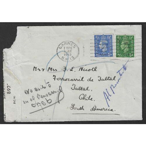 SS JOHN BIDWELL 1945-1960 salvaged mail cachet on reverse of 1945 Censored WWII Envelope sent from, London to Chile in 1945. The mail was left undiscovered until scrapping of the ship started in 1960 when 500 bags of mail were found, each letter has this cachet (CORRESPONDENICA RATARDADA / Y RECUPERDADA S / S JOHN BIDWELL / 1945-1960 / CORREOS DE CHILE on reverse which was then forwarded to Chile. Mail bags contained mainly newspapers.