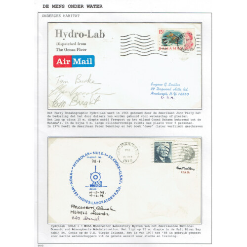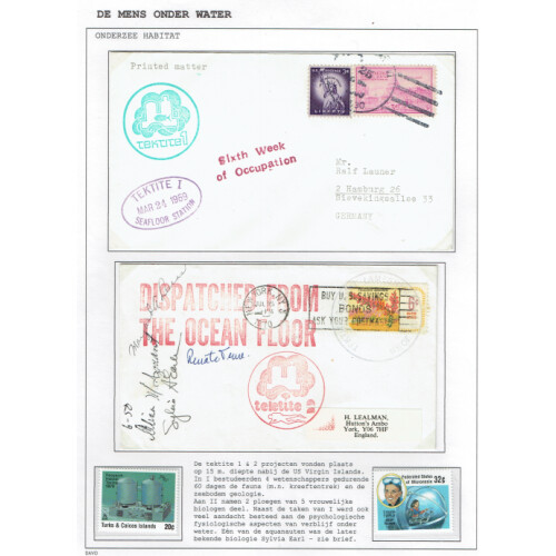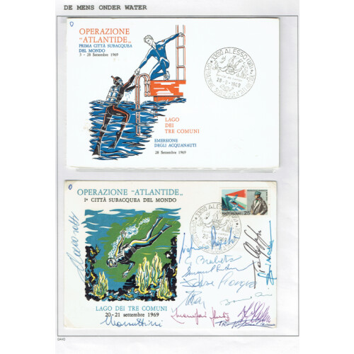 Underwater Maritime Mail: An extensive collection of worldwide countries, covers (c49), & miniature sheets (47) for Antarctic, Arctic and polar covers in well filled written up album (in Dutch) dozens of operations and expeditions, Italy 1942 marine censor, 1908-32 per Islands Falk, French. Southern & Antarctic Terr. 1965 Adelie Expedition Thala Dan cover incl SG 35 5f (Cat £90), 1960s Aluminaut submarine covers, Russian Expeditions incl signed, Japan Expeditions, Sea Floor stations incl Tektite I 1969, 1970 signed, Undersea stations, 1969 Italy Operation Atlandtide multi signed, Helgoland German underwater station, Bahamas 1965 Hydro-lab Ocean floor cvr, 1965 USN Dolphin Mail signed, 2007 Vanuatu underwater post, cinderella labels Gott Straffe, Diamond Reef USA $10 (sample ovpt), etc, fascinating lot