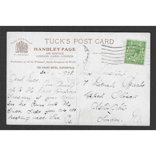 1928 (30 Jan) Handley Page plan PPC on printed Tucks postcard. HANDLEY PAGE / AIR SERVICE / LONDON - PARIS - LONDON tied ½d green wavy line cancel to London. Nice card.
