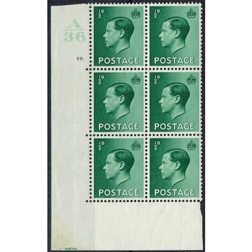 1936 ½d green A36 10 dot corner cylinder blocks of 6 mint / U/M with R20/2 showing extra pearl next to crown variety.