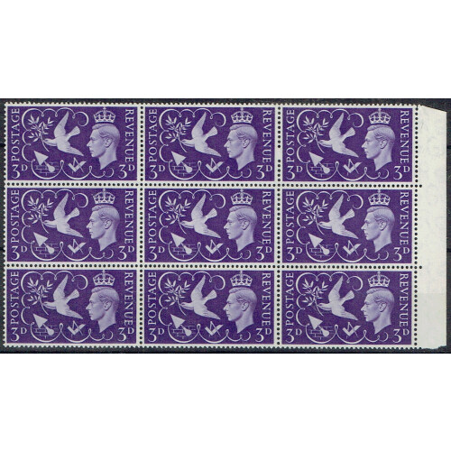 1946 Victory 3d violet in right hand marginal block of 9 with top middle stamp showing seven berries variety U/M. Fine. SG QCom 9b. (SG 492a).