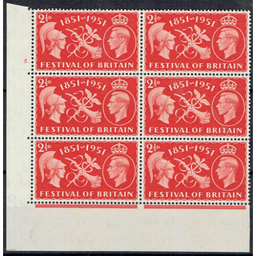 1951 Festival of Britain 2½d in bottom corner marginal cylinder 5 dot block of 6 with bottom right stamp showing deformed small 2 variety U/M.