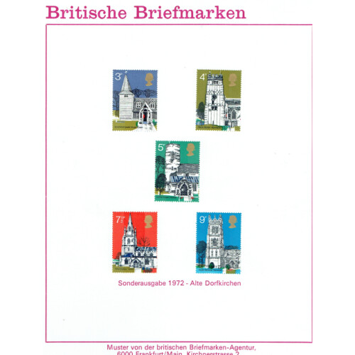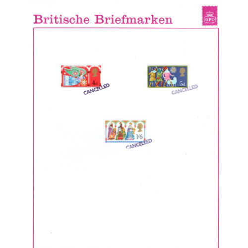 1969-70 GPO Official; A4 size sheets bearing sets of stamps for 1969 Technology, 1969 Xmas & 1970 Cottages mounted on display sheets for publicity overseas printed in German, Britische Briefmarken GPO, each tied by CANCELLED h/s in blue or violet, plus 1972 Churches set uncancelled on publicity sheet, very scarce, rarely offered. (4)