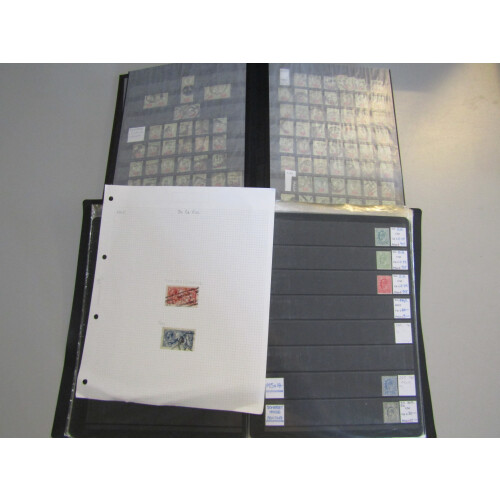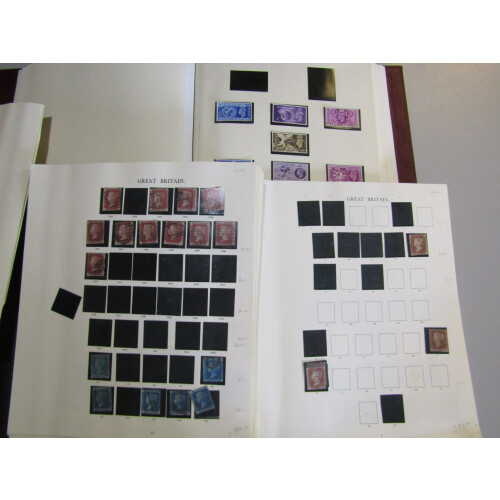 Great Britain small accumulation in large stockbook, on leaves and stockpages with some better noted including QV postmarks on paper for QV line engraved and Surface printed with Edinburgh, 1841 2d pair, railway cancels, numeral duplex cancels, large duplicated stock of 1887 values to 1s, many 100s incl cds copies, 1854 to QEII colln on Windsor albums pages with some useful, GVI/QEII mint singles and coil strips, many with watermark varieties, 2004 Crimea war medal replica cover, etc, 100s.