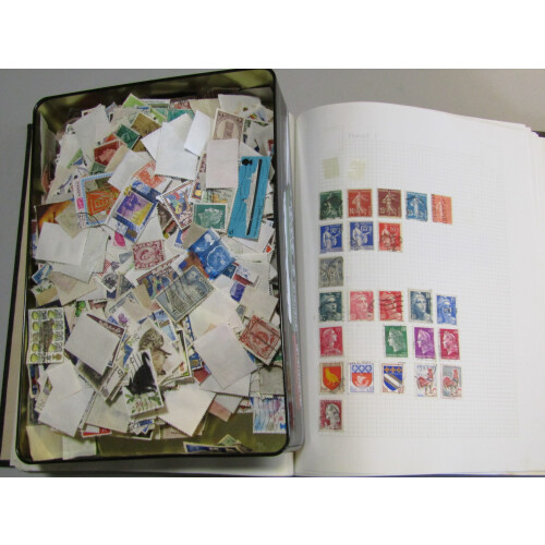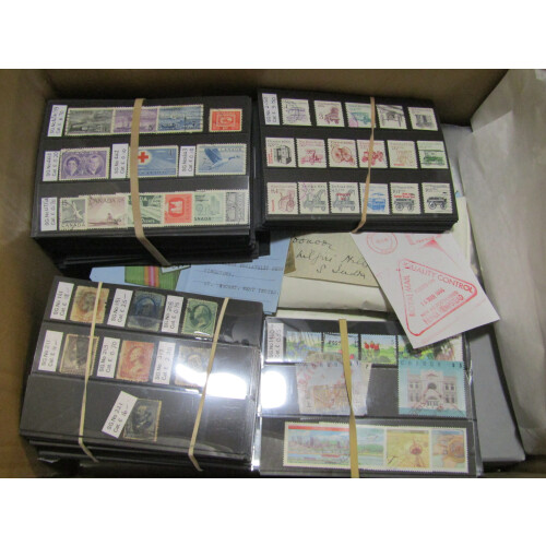Mixed accumulation in a box with 100's on stockcards with USA, E. Europe thematics, packets, loose, collections of W/W in springback, flowers thematics on large leaves. 100s.