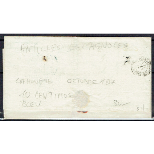 1867 Entire Letter Havana to Puerto Princip bearing 10c blue Queen Isabella II tied blue oval barred cancel with trade h/s in blue alongside, tiny arrival backstamp, nice example.