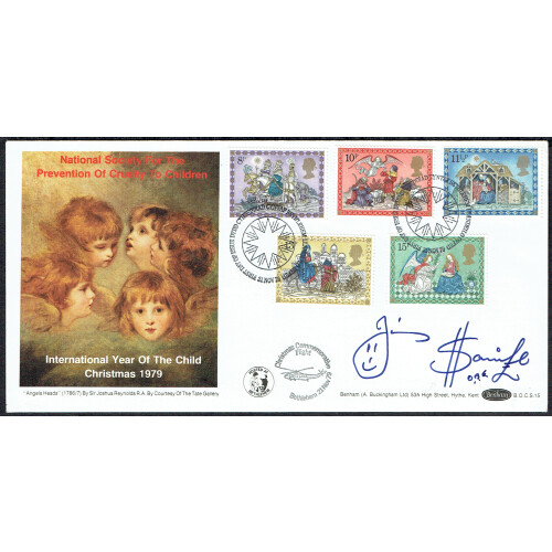 1979-1981 Two GB covers one Benham silk from 1981 commemorating the wheelchair games and 1979 Christmas set on IYC NSPCC illustrated cover cancelled Bethlehem postmarks plus Christmas Flight cachet from Bethlehem, both signed by Jimmy Saville with his trademark happy face one as Sir & another with OBE on his autograph.