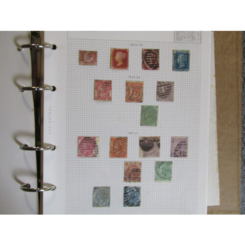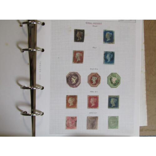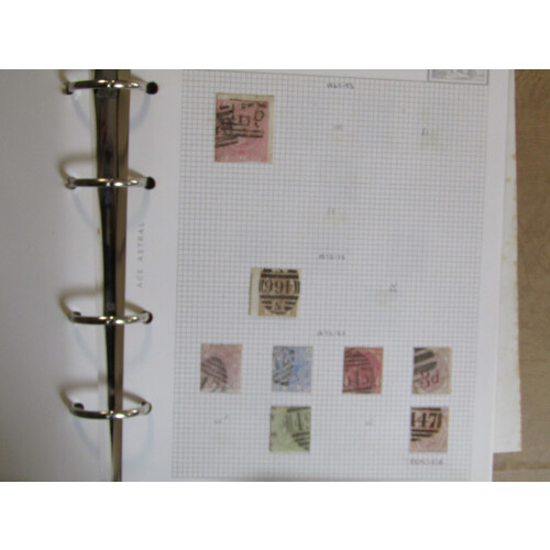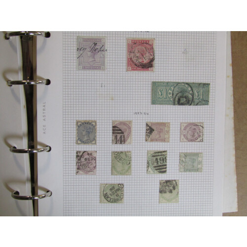 Collection on loose-leaf leaves in a Ace Astral binder, very mixed assembly including 1840 1d black (no margins, cut into), 1840 2d blue 2 margins, 1856 set 3 values, 1862 to 6d (6d is nicely used), 1865 to 2s deep blue (sound cat £240), 1877 4d sage-green used (Cat £325), 1876 8d orange heavy used (Cat £350), 1891 £1 green clipped perfs all round (cut into), 1883-4 lilac and green set used (varying greens), 1865-79 1d plate 200 mint (off centre), etc, very mixed, high catalogue value.