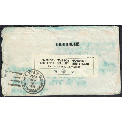 1943 DAMAGED BY SEA WATER violet boxed handstamp on cover Nevada to New York, redirected to London with RETURNED LETTER SECTION / LONDON POSTAL REGION. Interesting unknown wreck cover.