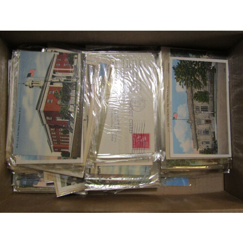 United States: Nice unused collection in a shoebox of US post office buildings from around the states, mainly coloured circa 1940s to 1950s, all in sleeves, very fine, approx. 225. High retail potential.