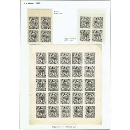 Moresnet: 1867 Moens 10p black bogus stamp printed in imperf ungummed sheets of 25, plus perf 12½ single, perf block of 4 and imperf block of 4. Belgian Jean-Baptiste Moens produced this value from Moresnet Neutral condo. to trick a French stamp journalist (who copied Moens work) into accepting their use as genuine in 1867. (34 stamps).