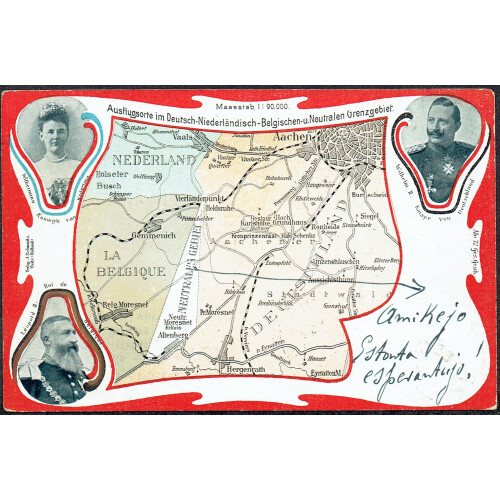 Moresnet: 1908 Moens 10p black bogus stamp printed for Moresnet tied to a illus postcard of map for the neutral Moresnet area written in Esperanto explaining how he lamented not being able to attend the 4th Esperanto Congress in Dresden in 1908. Sent from Beyne Heusen to Antwerp. Very scarce use of the Belgian Jean-Baptiste Moens bogus stamp produced to trick a French stamp journalist (who copied Moens work) into accepting their use as genuine in 1867.