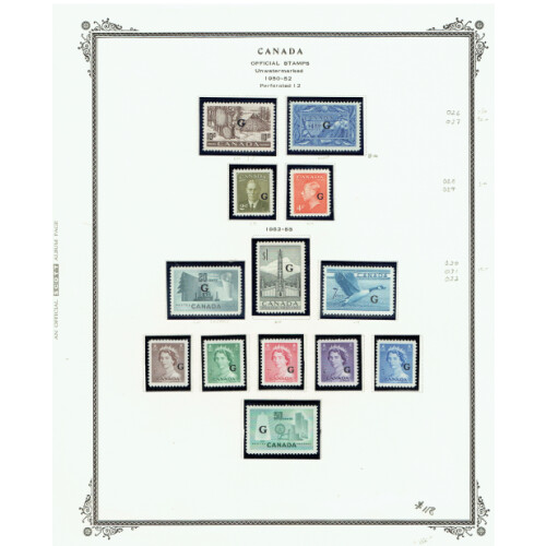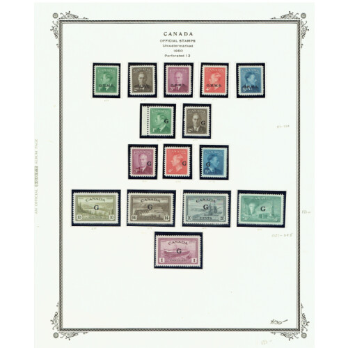 OHMS Overprint officials: Mint and mainly unmounted mint assembly on Scott printed pages with 1949-50 set of 10 mint or U/M (SG O162/171, Cat £275), 1949-50 set of 6 U/M (Cat £65), 1950 G ovpts set U/M (Cat £200), 1950-51 10c & $1 (Cat £80), nice collection. (38).