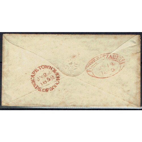 1859 (22 July) Soiled cover to London bearing 1858 6d pale rose-lilac large two margins tied triangle CGH cancel in black with CAPE OF GOOD HOPE cds and PORT ELIZABETH oval dated cancel backstamps in red. Sent Per mail Steamer, stamp has large uneven margins just nicked into SE corner, small tear to left, SG 7. Cat £1000+ on cover.