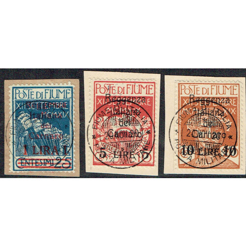 1920 Military Post overprinted Reggenza Italiana del Canaro overprint set of 17 with top values cancelled by favour on card by FIUME DI ITALIA cds cancels, SG 146/162.
