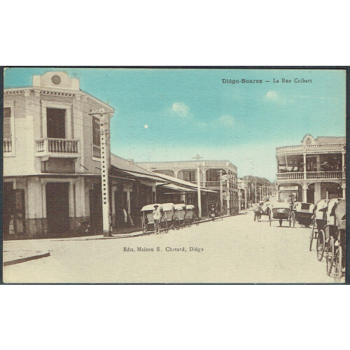 Diego Suarez: 1938 FM Military colour postcard of La Rue Colbert unstamped to France with manuscript F.M. and violet MARINE NATIONALE SERVICE A LA MER anchor cachet. LA REUNION A MARSEILLE datestamp alongside.