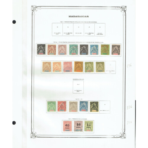 Madagascar: Attractive collection on Yvert printed leaves mint and used with nice earlier material including 1891 imperf 5c, 15c & 25c f.u., 1895 Tablet overprinted 5c mint, used selection 15c, 25c, 40c, 50c, 75c, 1f & 5f (Cat £525), 1896 set to 5f mint, 1902 surcharges incl large zero printing, 1903 Zebu to 75c mainly mint & 5f black mint (Cat £95), 1908 301921 surcharge set mint, postage due 40c mauve imperf mint, vals to 5f mint. Mainly clean lot. (c230).