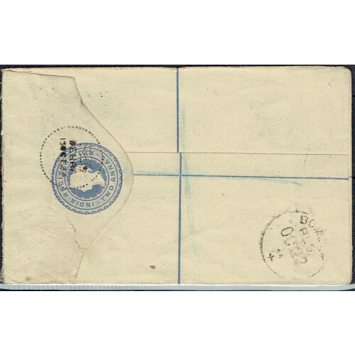 1894 2a blue registered postal stationery envelope uprated on the front with another 2a ultr. both cancelled with unusual dotted circle cancel with dotted REG. DEHRA 15 OCT 94 cancels, with boxed R / DEHRA DUN in black, addr to Bombay. Scarce cancel, uniquely made by the postmaster?, short period of use?