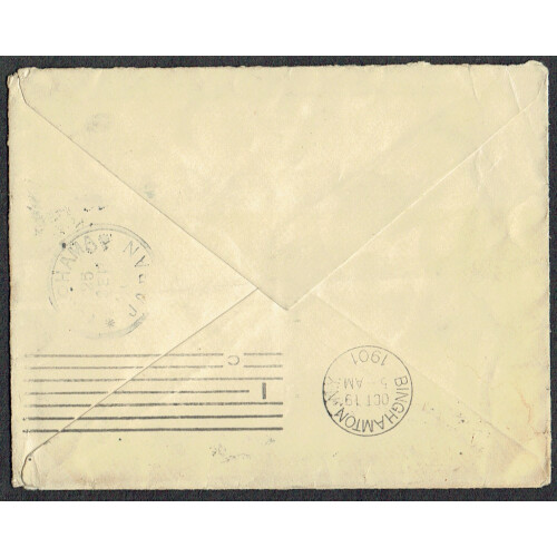 Post Offices in China: Cover to USA (stained) bearing 10s blue ovptd in black tied SHANGHAI cds and YOKOHAMA backstamp alongwith arrival machine mark.