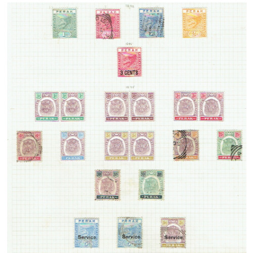 Perak: 1892- 1960 Collection of mint and used on leaves with useful including 1895 Tigers 1c to 3c & 5c mint pairs, 8c mint, used from 10c to 50c (both), 1900 set 7 mainly mint, 1935 set 15 mainly used to $5, 1938 set to $2, 1950 set, 1948 RSW set mint, 1957 set. Clean and valuable lot. (Approx 130)