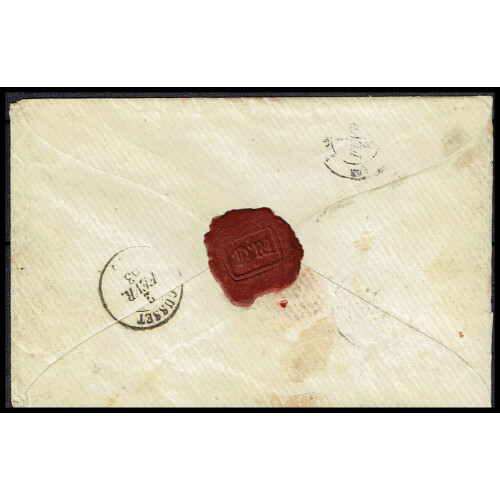 1862 (28 Dec) CEMF French Expeditionary Corps in Mexico: Cover bearing Napoleon 20c blue and 40c orange pair tied four strikes of CEMF dotted diamond cancels with Bureau F CDS alongside paying the 100c rate to Cusset France sent via England. Higher letter bureau are much scarcer.