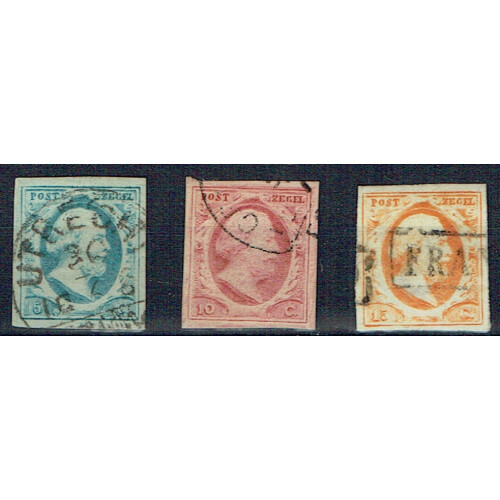 1852-63 Set of three values each with four good margins fine used incl both cds used for 5c pale blue, 10c pale rose-red, 15c deep orange yellow (Franco cancel). Nice trio.