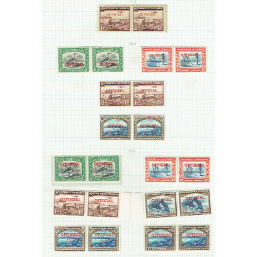 Officials: Collection on two album pages mint; 1929 2d pair and blocks of 4 with no dot after ovpt variety, 1931 set 4, 1938 1½d pair (SG O17), 1945-50 set 4 (Cat £80), 1951 set (Cat £48). Clean and attractive lot (52)