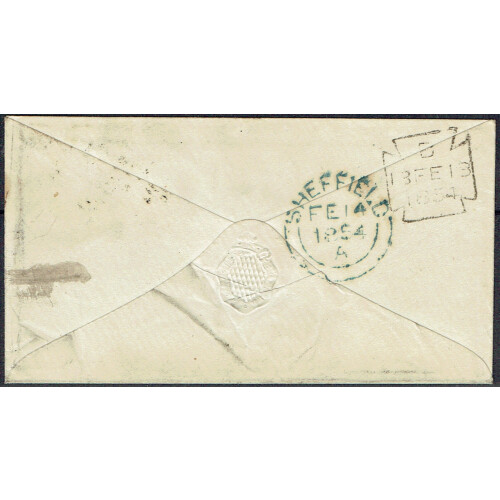 1854 Envelope London to Sheffield bearing two 1d red imperf on blued paper tied 14 numerals with E/MR in circle applied on arrival in Sheffield for Ellesmere Road. Good strike.