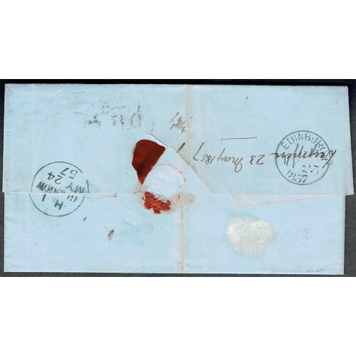 1857 1d red-brown pl.31 (JC). Very fine wrapper sent from Drymen to Edinburgh neatly tied by black DRYMEN Scots local cancellation (Type III). Backstamped by a green Glasgow transit cds and Edinburgh arrival cds. Alock scarcity rating C.