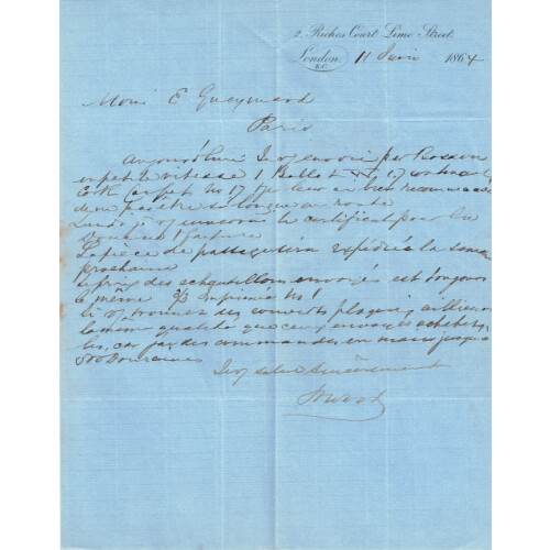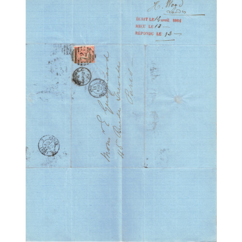 1863-64 An original French correspondence from East London to Paris written in French. 26 Entire Letter folded horizontally across each letter for filing each bearing 4d red (hairlines) tied mainly numeral cancels for LONDON EC 72, 73, 74, 75, 76, 78, 80, 81 89, 90 (on a pair), 91, 92, E/11, E/12, E/17, S/16. Mainly fine used with French arrival backstamps. Nice original lot, huge cat value of £7800 on cover (Rated £300 each in SG). SG 81/2. (26).