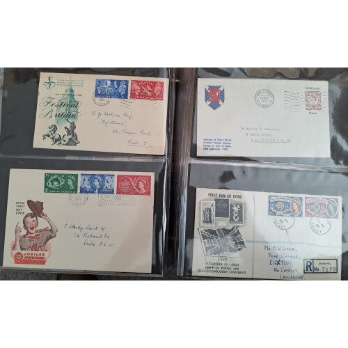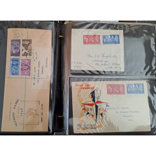 1937-1967 First Day Covers colln in cover binder including 1937 Coronation illus, 1948 Olympics Illus., 1951 Festival illus (2 diff) 1940 Stamp Centenary on plain cvr, 1948 RSW low value on printed cvr, 1957 Scout illus., 1961 Parliamentary Conference (3 types), 1961 CEPT, NPY, 1963 FFH (2 diff), 1964 Lifeboat, 1963 Red X, 1964 Botanical both ord and phos sets, Geographical phos set, plus 1960s later both ord and phos issues. Useful range and cat value. (approx 65).