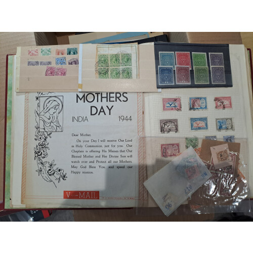 British Commonwealth and foreign being the balance of an old time lot, on leaves, cards and loose including better throughout noted Sudan old time collection mint and used incl sets to 50p, Malta QV 5s unused, NSW 8d perf used with unusual '1' cancel in blue, Ireland 1922 10d mint, Queensland 1s grey, Aden Camp postmark on piece, Bahrain QEII 2r on 2/6 mint with bar variety, 10r on 10s mint, BVI to 1s, Trinidad earlies on page, Nova Scotia to 12½c m & u, Tibet, RSW Morocco Agencies mint, India 1944 Mother's Day V. Mail forms (2), St Vincent GVI mint blocks, USA mint sheets and blocks for 1940s-50s, world in three old time springbacks incl Argentina, Br. Colonies etc, interesting sorter. 100s.