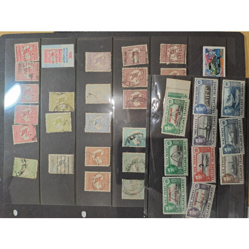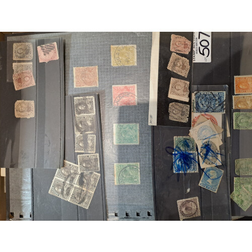 Smaller Box with an interesting miscellany on stockcards, packets, pages etc Br. C/W, noted Australia Roos, Australian states, India 1854 ½a blue, Germany in old time exercise book etc. 100s.