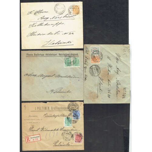 Finland: Useful group of circa 1900 covers including printed envelopes, multi combination covers, registered to Helsinki etc noted Warde 1m20 combn, UUSIMAA PORVOOSSA ptd env from Borga, Helsingfors St. P.Burg 20p rate, Cvr Kaukjarvi 20p orange P/S envelope, Cvr Kristinestad / Kristina 40p combn, very mixed but intr group. (9).