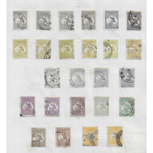 1913-1936 Collection mint and used with better throughout including 1913-14 used to 1s & 5s, 1913 6d Kookaburra used, 1914-20 GV incl 4d shades (6), 1915 Roo to 2s brown, 5s (2 heavy used), 1918 to 1/4d (2), 1924 1d no wmk mint (SG 84), 1926-30 set used, 1927 2d & 4d mint (Cat £105), officials OS perfin mint and used on commem issues, OS ovpt on Kingsford set 2 used (Cat £130), 1932 6d chestnut Roo mint (Cat £55), etc. (240).