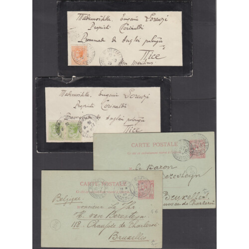 1906-07 Two postal stationery 10c red postcards from the Principality to Brussels with receiving CDS. Plus two 1925 Mourning covers from Monte Carlo to Nice with 30c and pair of 15c.