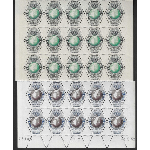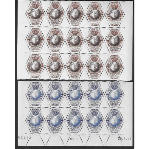 1952 (April) REINATEX Philatelic Exposition labels for seven different colour combinations in blocks of 10 or 15 several are bottom sheet imprint blocks, total of 150 unmounted mint examples, nice in such multiples.