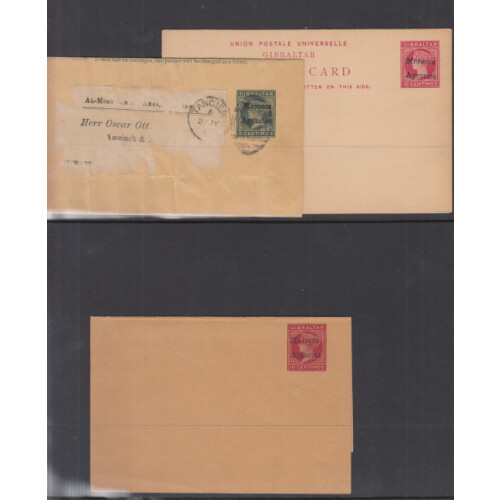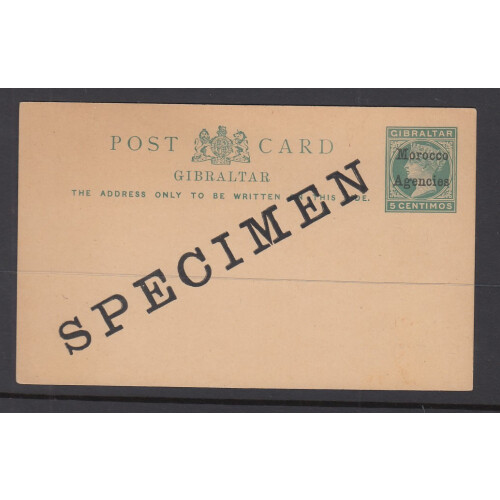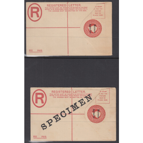 QV Postal Stationery useful overprinted range of mainly unused including 10c red postal card and wrapper, 20c vermilion registered envelope unused and another overprinted SPEMINE diagonally, 5c green postal card overprinted Specimen diagonally and used newspaper wrapper, useful group. (6).