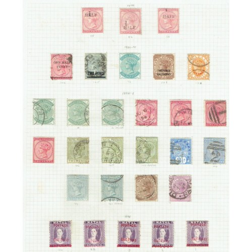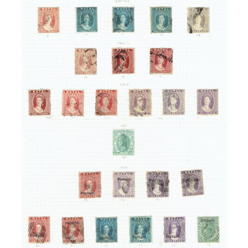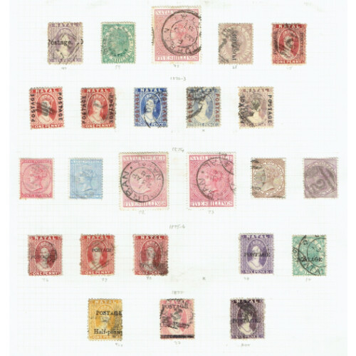 1859-1896 Useful used assembly noted 1859 Chalon Heads to 6d (SG 9-13 Cat £395), 1862 1d (SG 15), 1863 (SG 18-19), 1863-5 1d to 6d (SG 20-25 Cat £247), 1869 Postage Ovpts to 1s for diff printings (Cat £1190), 1874 1d (SG 65 cat £130), 1870-73 Postage vertical ovpts, 1874 5s rose (3 shades 1875-6 1d both shades (SG 76/7 Cat £205), 1876 1d (SG 81 Cat £130), 1877 surcharges, POSTAGE with dot on 6d violet, 1877 ½ HALF surchs mint (3), 1880 set 6 used, 1891 2½d on 4d brown mint, 1895 ½d on 6d violet 5 types mint, etc, comprehensive lot. (77).