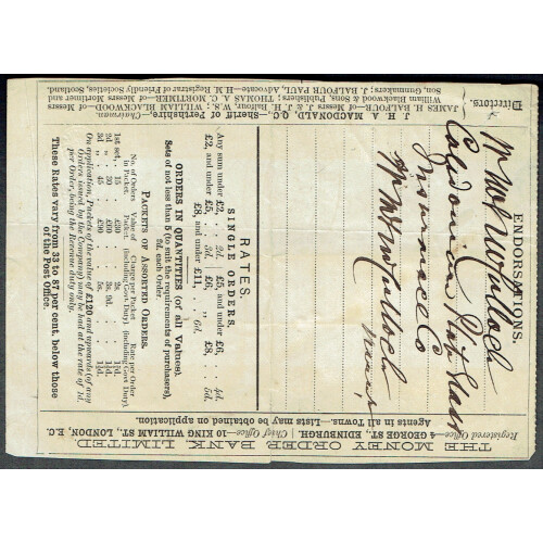 1882 Money Order for 14s 9d issued by The Money Order Bank Limited, bearing 10s, 2s (2), 6d & 1d (3) square adhesive stamps used to make up the value and albino 1d embossed GB cheque stamp at upper right, stamps cancelled by Money Order Bank handstamps dated May 30th 82 and Royal Bank of Scotland Company oval handstamp in black. A tremendously rare document from this short lived bank, which was established in March 1881 to compete against the Post Office's newly introduced Postal Orders. The bank was wound up less than two years later on 25th January 1883 leaving very few surviving orders. Superb!